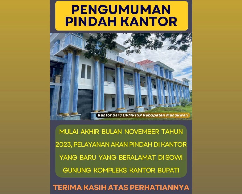 Post navigation Previous Sosialisasi Implementasi Perizinan Berusaha Berbasis Risiko dan Pengawasan Perizinan Berusaha Berbasis RisikoNext Gathering Badan Usaha dan Media bersama BPJS Kesehatan Cabang Manokwari Tinggalkan Balasan Batalkan balasanAlamat email Anda tidak akan dipublikasikan. Ruas yang wajib ditandai *Komentar * Nama * Email * Situs Web Simpan nama, email, dan situs web saya pada peramban ini untuk komentar saya berikutnya. Lebih Banyak Cerita Uncategorized Penetapan Jam Pelayanan selama Bulan Ramadhan 1446H/Tahun 2025 Maret 17, 2025 Helin Dwi Boro Prastiwi Uncategorized Selamat atas Pelantikan Bupati & Wakil Bupati Kabupaten Manokwari Periode 2025-2030 Februari 25, 2025 Helin Dwi Boro Prastiwi Uncategorized PIAGAM PENGHARGAAN TAHUN 2024 Desember 16, 2024 Helin Dwi Boro Prastiwi